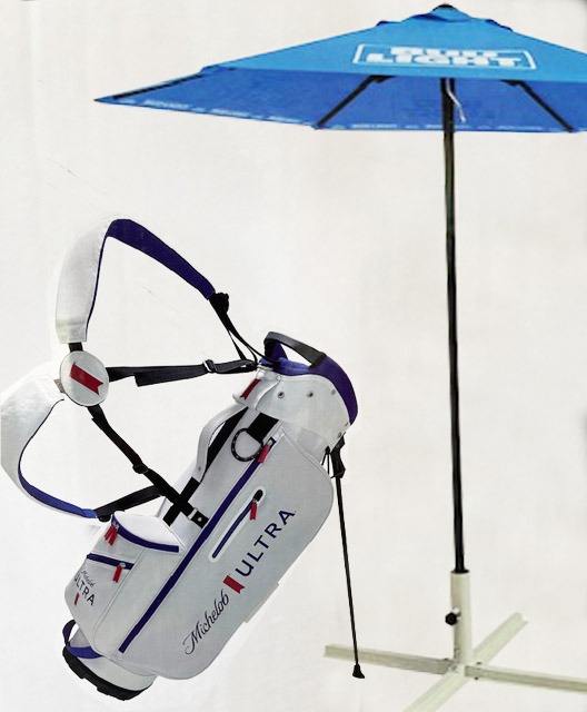 An outdoor package with a beautiful new ULTRA golf bag and a large Bud Light outdoor umbrella