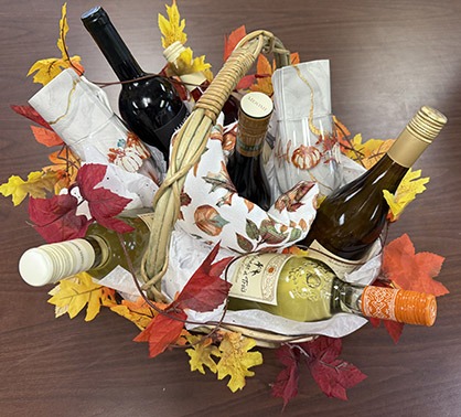 An assortment of six bottles of various wines – Chardonnay, Malbec, Moscato, Pinot Grigio and more – with Fall themed stemless glasses